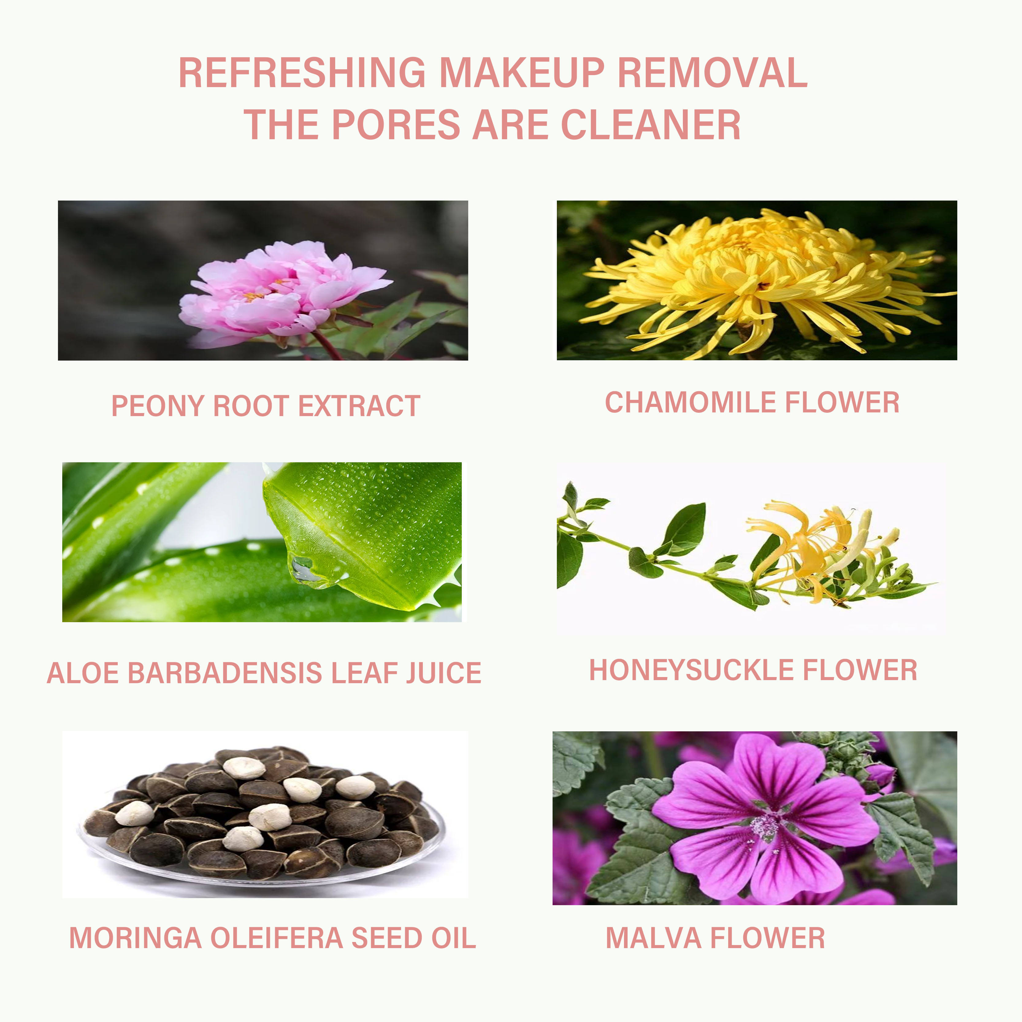 - Peony root extract, Chamomile flower, Honeysuckle flower, Malva flower, Aloe barbadensis leaf juice, Moringa oleifera seed oil